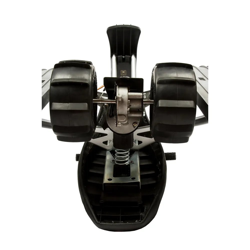 Визуального модный электроснегокат выглядит компактно и эргономично. Общий вес техники сравнительно легкий, составляет 12,7 кг. Конструкция рамы – долговечная и надежная, стальная, не деформируется при эксплуатации в жестких условиях. Большое удобное сиденье покрыто экокожей. Мягкое, повторяет анатомические части тела ездока. Лыжи изготовлены из ударопрочного пластика, гарантируют отличный накат.