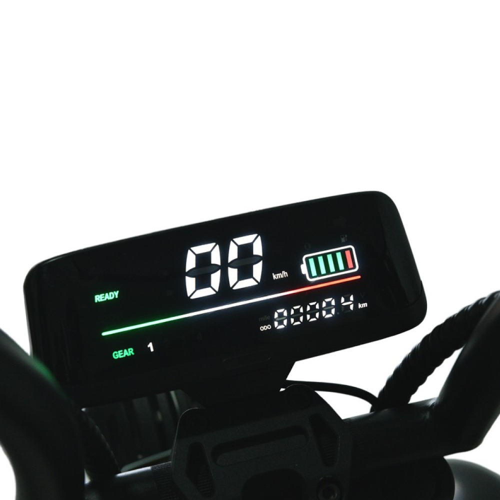 Информационная панель показывает скорость, заряд, пробег и режим. Доступны круиз-контроль, базовое освещение и опциональные трекер/сигнализация.